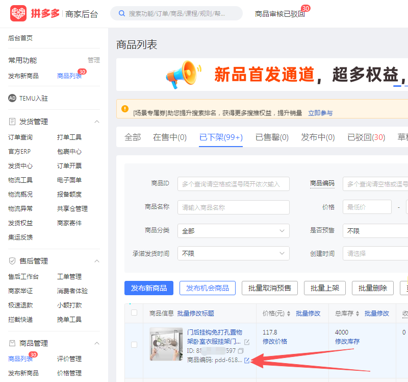 第三步:软件提示上传完成后,进入拼多多商家后台,找到刚刚上传成功的商品,点商品编码后面的编辑图标;