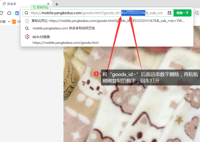 第五步,打开电脑浏览器,进入拼多多首页,随便点开一个商品,在上方的地址栏内,找到“goods_id=”,将后面这串数字删除,粘贴刚刚复制的商品ID,再回车打开就可以看到原商品了。