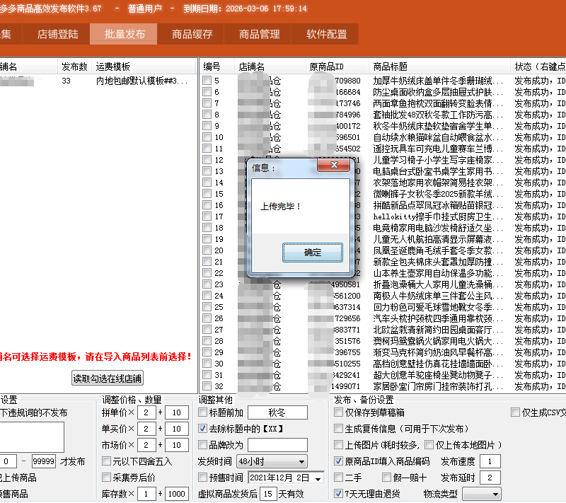 附上一张复制宝贝上传到拼多多店铺的截图: