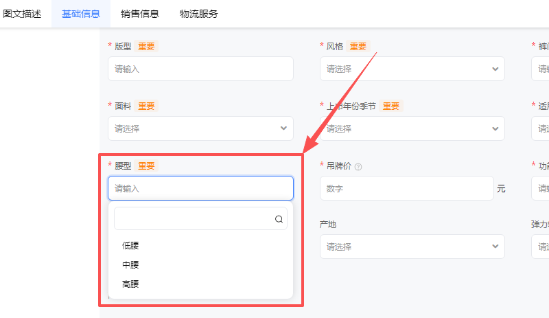 我们进入原宝贝所在类目的发布页面,【商品属性】中找到“腰型”这项属性,可以看到,现在发布该类目的宝贝,“腰型”只能选择“低腰”“中腰”“高腰”三项属性值,原宝贝所填的“中高腰”不在选择内。