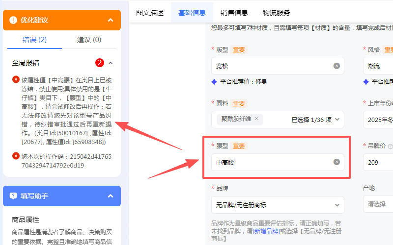 问题一:该属性值【中高腰】在类目上已被冻结,禁止使用;具体禁用的是【牛仔裤】类目下,【腰型】中的【中高腰】,请尝试修改后再操作;若无法修改请您先对该型号产品纠错,待纠错审批通过后再重新操作。