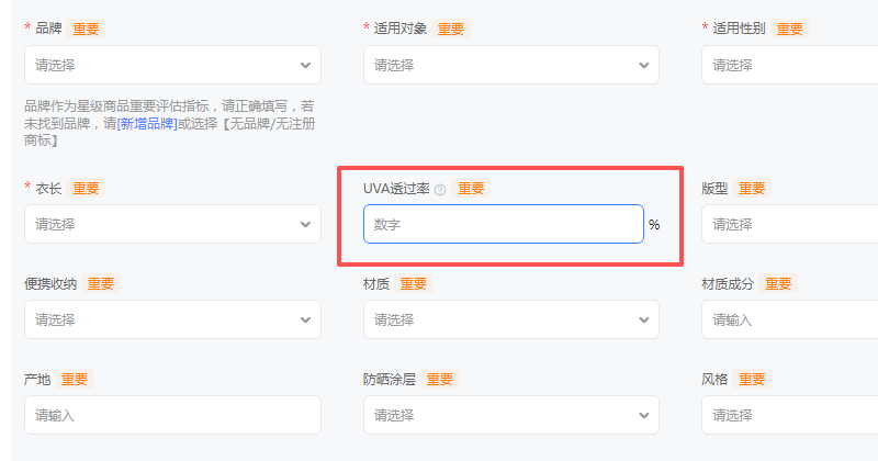 错误提示中提到输入的“UVA<5%”是错误值,我们进入原宝贝所在类目的发布页面,在【商品属性】中找到“UVA透过率”,发现现在淘宝发布此类宝贝时,“UVA透过率”的属性值只能填写一个确切的值,也就是整数加单位的填法,原宝贝在发布时还没有这样的要求,原宝贝填写的“UVA<5%”现在无法填入,所以在复制上传时就出现了“输入值‘UVA<5%’错误,设置信息不完整,请填写值”的错误提示。