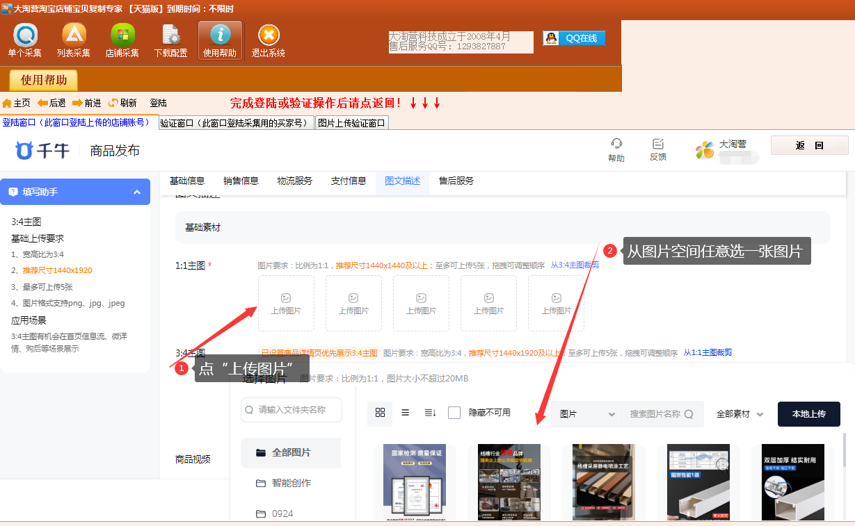 (2)点“1:1主图”内的“上传图片”,从店铺的图片空间中任选一张图片上传;