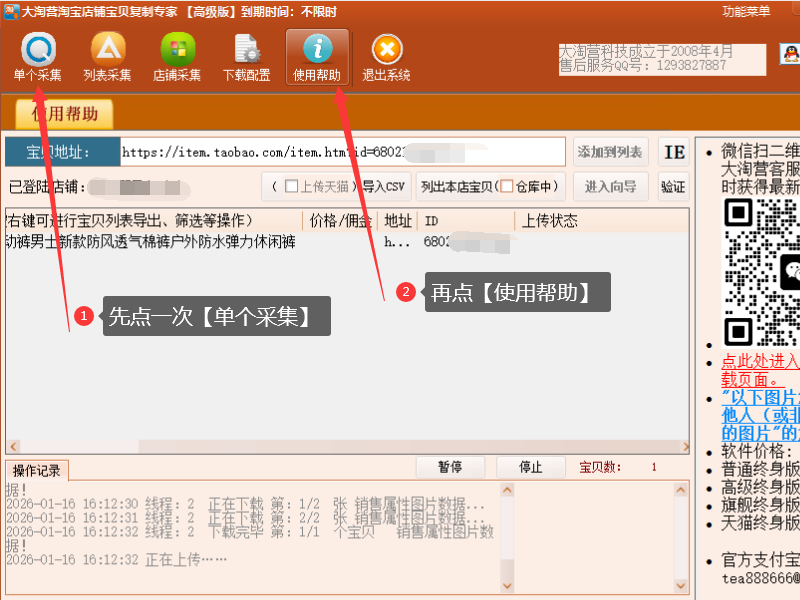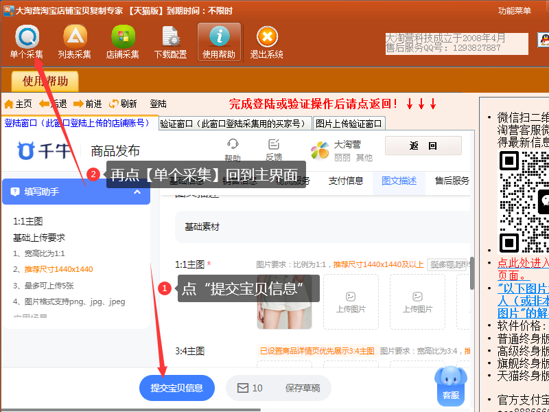 (3)选择完主图,点一次下方的“提交宝贝信息”,再点软件上方的【单个采集】返回到软件主界面,等待软件继续上传宝贝。