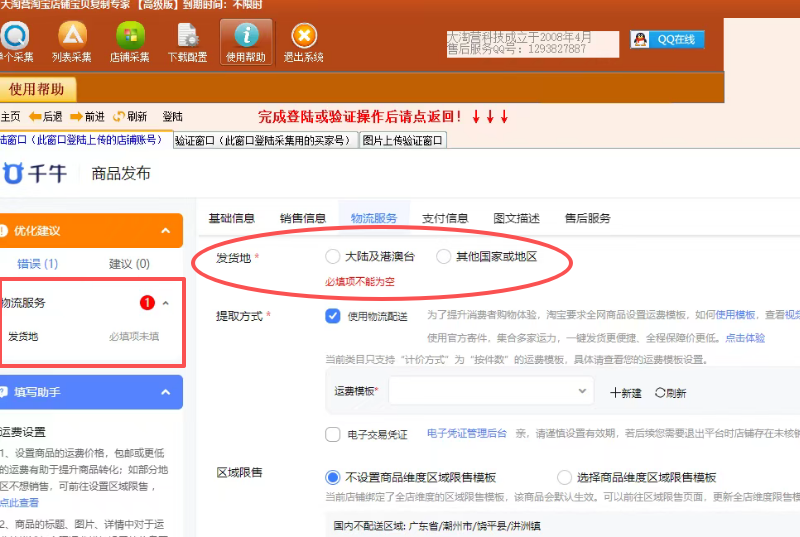 (1)点击“发货地”这个红色错误,定位到“发货地”的位置,选择“大陆及港澳台”;