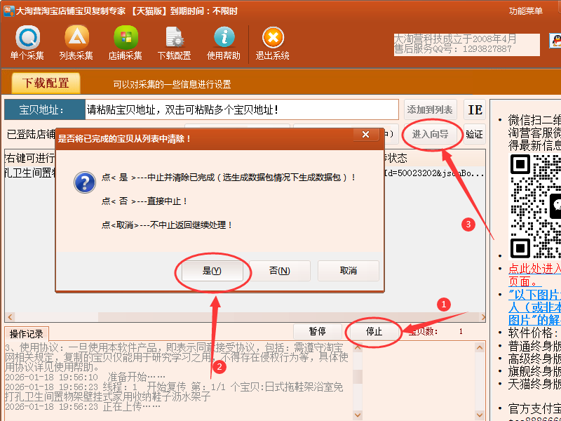 点击窗口右上角的“返回”,回到软件主界面后,点“停止”,点“是”,再点“进入向导”重新上传宝贝。