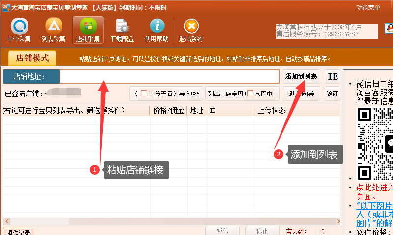 按照淘宝的规定,在淘宝网上,一家店铺最多只能显示2000个宝贝,如果店内宝贝超过了2000个,从第2001个宝贝起,就会重复展示前面的商品。如果要复制的店铺,店内宝贝数量不超过2000,则可以直接在 大淘营淘宝宝贝复制专家软件 【店铺采集】页添加这家店铺链接进行列表;那如果宝贝数量超过了2000,要怎么操作才能在不重复的情况下复制整店宝贝呢?