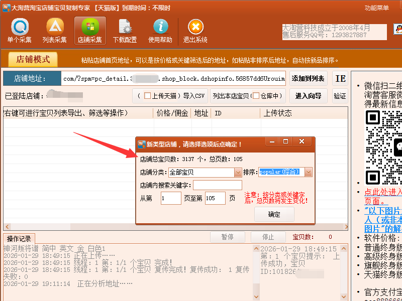 2、此时软件会弹出一个窗口,显示该店铺店内宝贝数量、宝贝页数、店铺分类这些信息,比如我现在列表的这家店铺,有3000多个宝贝,店内宝贝总页数是105页;