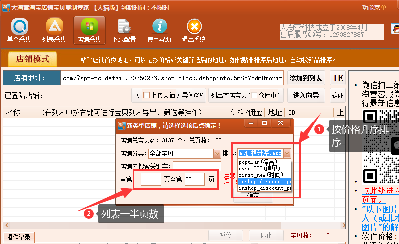 3、在弹窗中,选择排序方式“价格升序”,列表1-52页的宝贝(如果店内宝贝总页数是双数,则取一半列表,如总页数为106页,则按价格升序列表1-53页),确认要列表的页数后,可5页5页进行列表,如1-5,6-10,11-15这样;