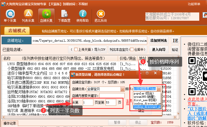 4、价格升序1-52页的宝贝列表完成后,再按“价格降序”列表1-53页(如果店内宝贝总页数是双数,则取一半列表,如总页数为106页,则按价格升序列表1-53页);